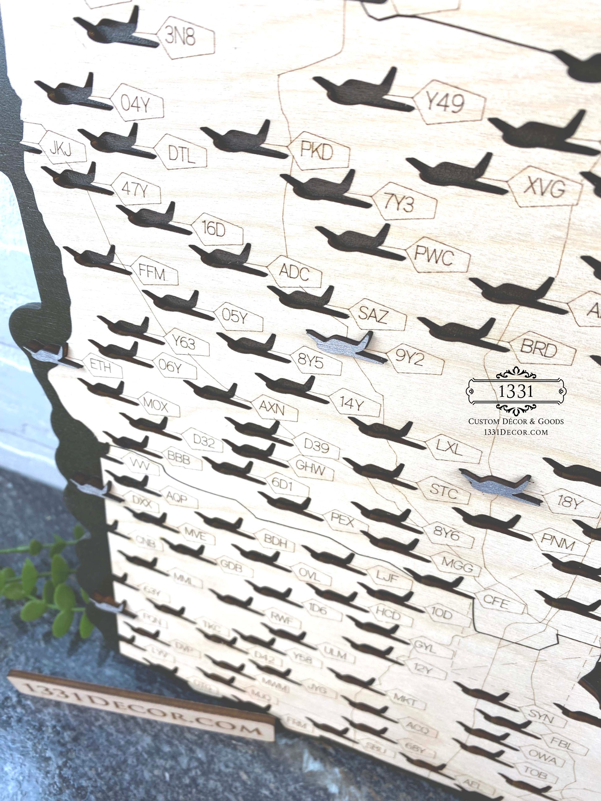 Track which airports you've flown into by placing an airplane into the map. Airplane pieces are a metallic silver. If you'd like a custom color to coordinate with your plane color, that is also available for an additional $7. Choose the custom color option and include the color you'd like.*