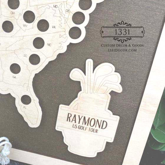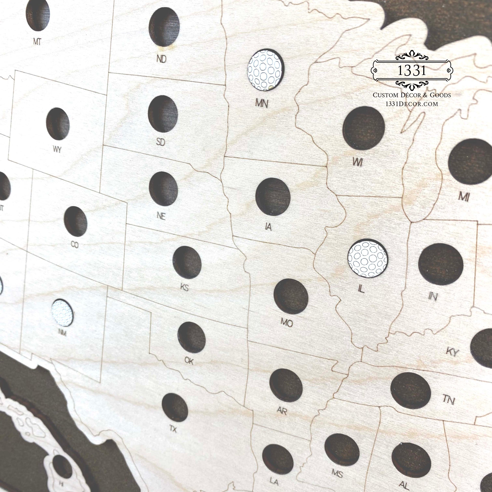 Made of two layers, the map includes little golf balls to check off the states. Simply peel off the back piece to expose the adhesive before placing in the appropriate state.